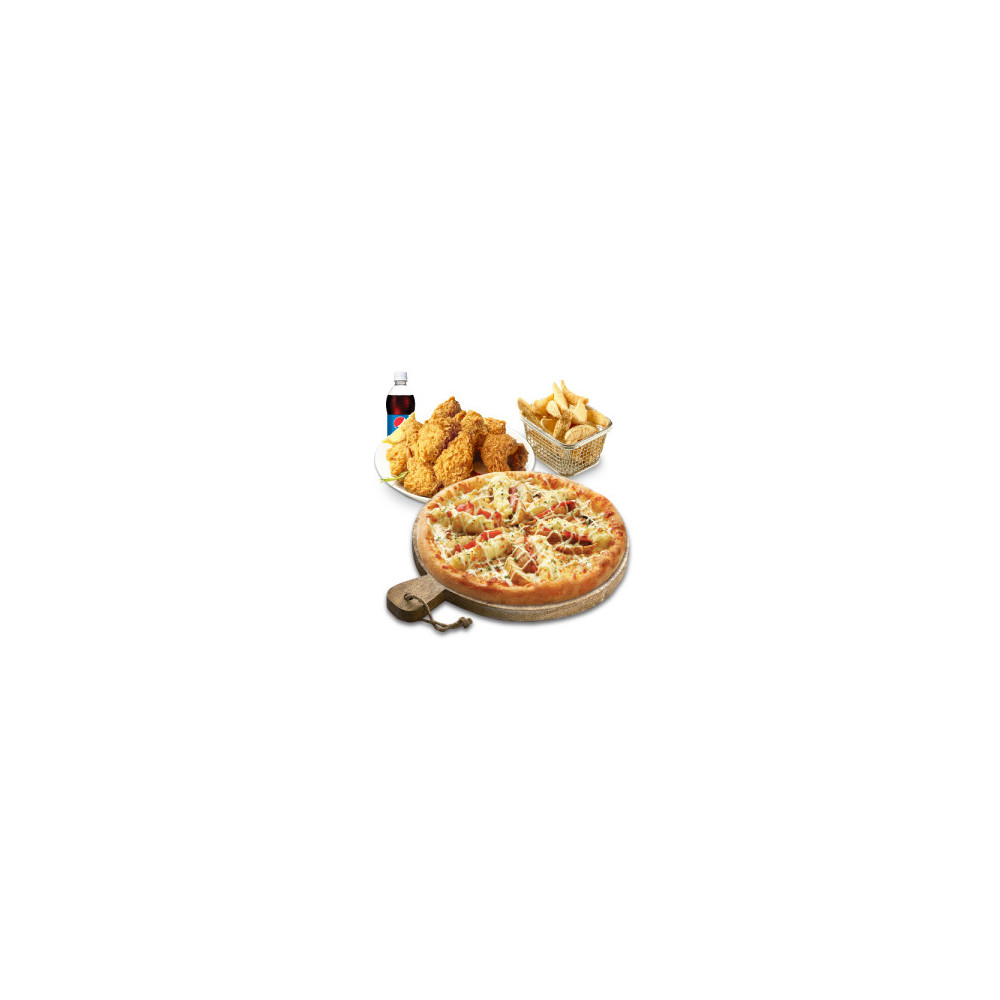 통통한 웨지감자에 매쉬포테이토가 요거트소스와 함께 어우러진 피자와 24년 전통 비법으로 더 바삭하고, 더 촉촉한 후라이드 치킨의 조합