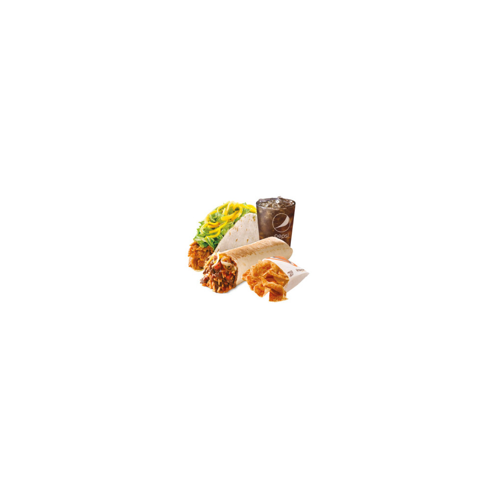 타코벨의 멕시코 정통의 맛을 느낄 수 있는 타코와 신선한 야채, 고기토핑, 치즈, 멕시칸 라이스 등 든든한 식감의 브리또로 구성된 메뉴로, 바삭한 나쵸칩스와 탄산음료가 함께 제공되는 타코벨 판매 1위 세트메뉴입니다.