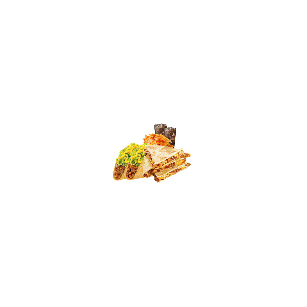 크런치 클래식 타코(비프) + 크런치 클래식 타코(카니타스) + 퀘사디아(치킨) + 나쵸칩스 + 탄산음료 2잔