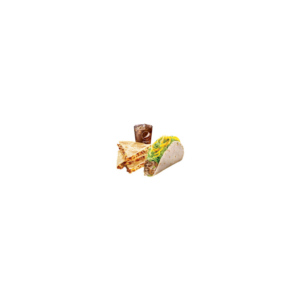 또띠아 속에 치즈 블랜드와 고기토핑을 넣어 그릴한, 치즈 매니아들이 선호하는 퀘사디아 메뉴에 소프트 클래식 타코와 탄산음료가 함께 제공되는 세트메뉴입니다.